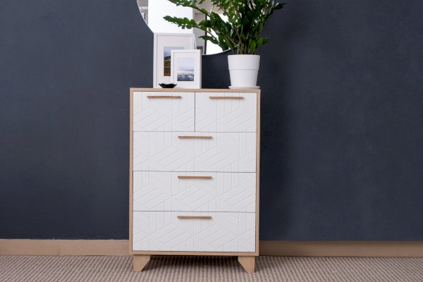 Комод Амстердам — вместительный и функциональный элемент как для спальни, так и гостиной. Модель оснащена тремя большими ящиками для хранения предметов одежды, текстиля и двумя маленькими — для личных вещей, документов, аксессуаров. Конструкцией предусмотрены шариковые направляющие полного выдвижения.