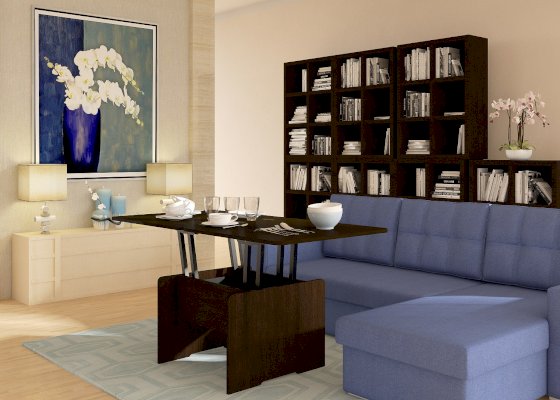 • Функциональность. Купив стол-трансформер потребитель получает сразу два изделия: небольшой журнальный столик и полноценный обеденный стол на 6–8 человек.